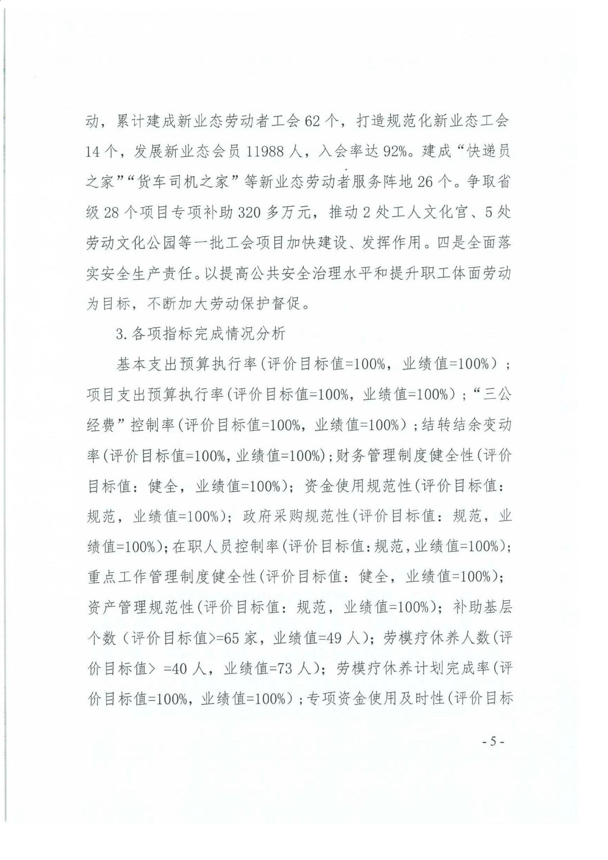 4、2024年省级劳模困难补助项目绩效自评情况:根据年初设定的绩效目标,项目绩效自评得分为98分。项目全年预算数为56.79万元,执行数为56.79万元,完成预算的100%。项目绩效目标完成情况:根据《甘肃省财政厅 甘肃省总工会关于下达2024年省级劳模困难补助资金的通知》,为省级困难劳模发放补助资金,用于帮助解决省级劳模生活困难和特殊困难。发现的主要问题及原因:一、绩效目标不够细化,未涵盖项目实施的全过程和关键环节。二、项目管理的长效机制不健全,劳模信息动态更新不及时,对新增劳模、退出劳模的识别滞后,影响补助的准确性和持续性;缺乏跨部门、跨区域的协同管理机制,政策执行的一致性和连贯性不足。下一步改进措施:一、通过细化项目绩效目标,明确可量化的目标指标,构建全面的指标体系,有助于提高项目实施的效率和质量,确保项目达到预期效果。二、健全长效管理与协同机制。建立劳模信息管理系统,实时更新劳模就业、收入、健康等状态,确保补助对象精准、动态调整及时。2024年省级劳模困难补助项目绩效自评情况:及时完成了2024年省级劳模困难补助资金的工作任务,该项目的实施,让省部级困难劳模表示真切地感受到了省委、省政府的温暖,激励他们在全社会发挥了很好的引领示范作用,为促进我省经济社会又好又快发展做出贡献。