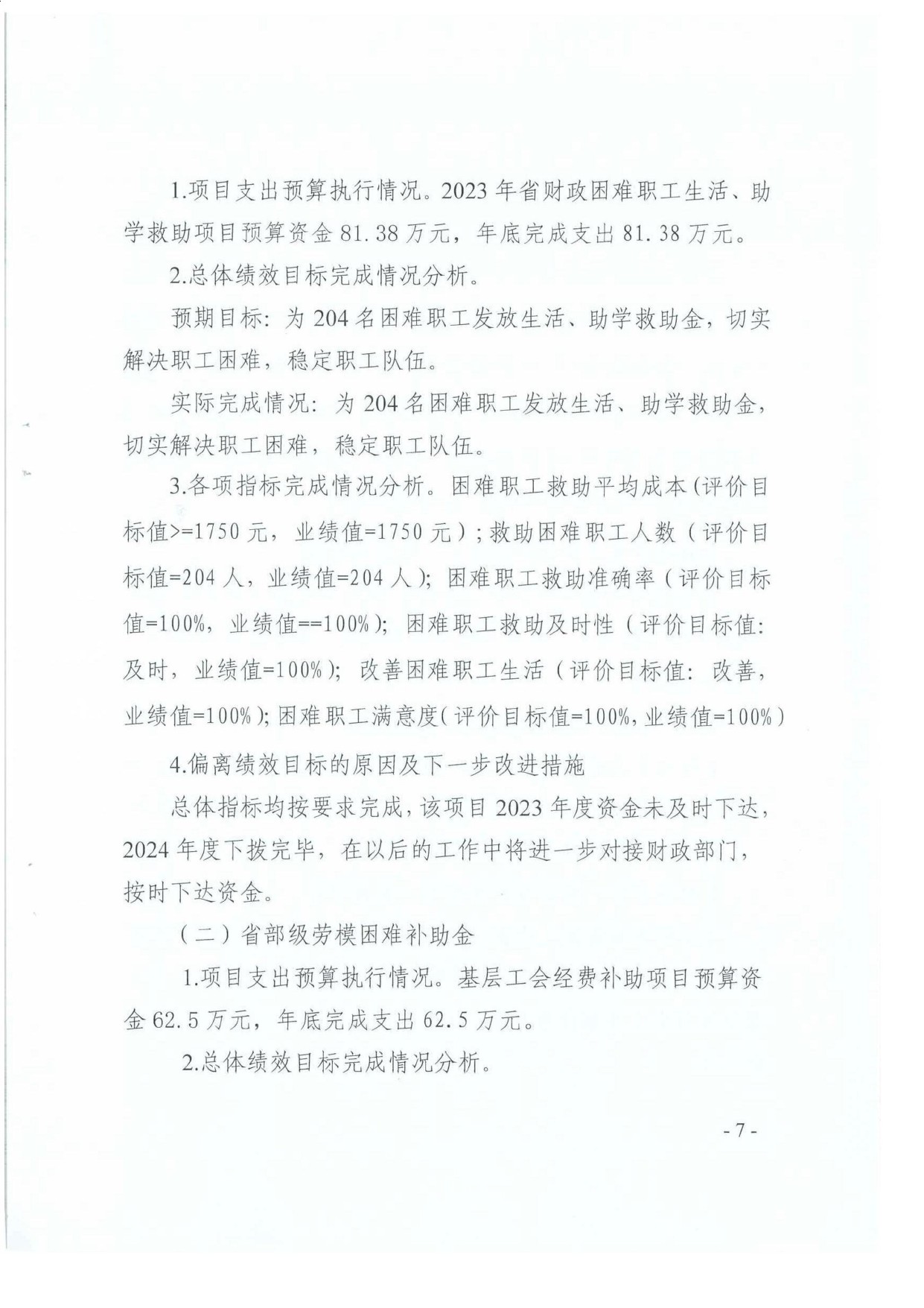 1.“2023年省财政困难职工生活、助学救助项目”项目绩效自评情况:根据年初设定的绩效目标,项目绩效自评得分为96.60分。项目全年预算数为81.375万元,执行数为81.375万元,完成预算的100%。项目绩效目标完成情况:为204名困难职工发放生活、助学救助金,切实解决职工困难,稳定职工队伍,有利于巩固城市困难职工解困脱困成果,协助政府兜牢基本民生底线。发现的主要问题及原因:一是资金使用审核周期较长;二是资金下发时间不够及时。下一步改进措施:一是提前谋划,尽早着手,及时准确下发资金;二是加强与财政部门的沟通,确保资金及时下发。2023年省财政困难职工生活、助学救助项目绩效自评情况:能够确保帮扶资金覆盖到市直在档困难职工,坚持依档帮扶,做到不漏一人,解决职工燃眉之急,需进一步提高资金支付效率。
