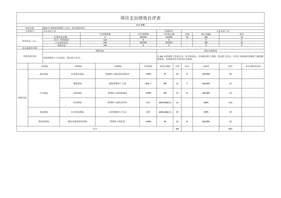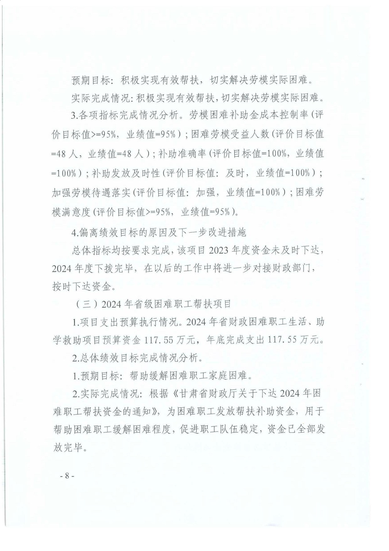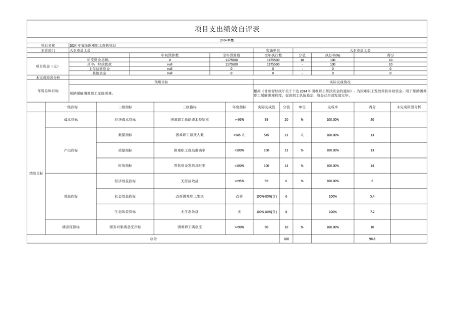 2. 2024年省级困难职工帮扶项目绩效自评情况:根据年初设定的绩效目标,项目绩效自评得分为98.60分。项目全年预算数为117.55万元,执行数为117.55万元,完成预算的100%。项目绩效目标完成情况:根据《甘肃省财政厅关于下达2024年困难职工帮扶资金的通知》,为困难职工发放帮扶补助资金,用于帮助困难职工缓解困难程度,促进职工队伍稳定.发现的主要问题及原因:指标设置不够精细。下一步改进措施:与业务部门沟通,年初做好绩效目标设定,科学合理的填写预期目标值。2024年省级困难职工帮扶项目绩效自评情况:项目覆盖到帮扶系统内所有符合条件的困难职工,解决职工实际困难。